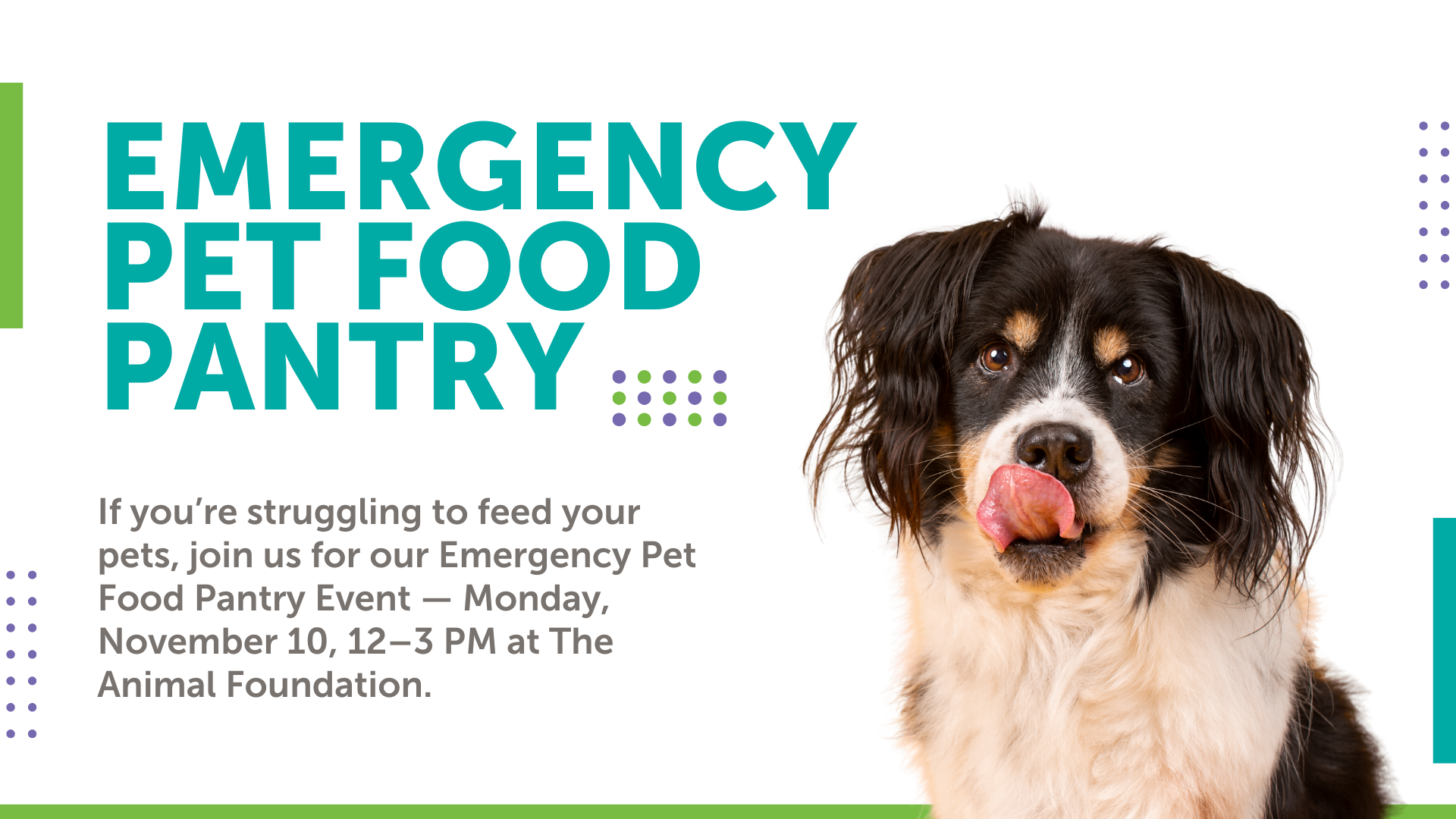 Join us Monday, November 10, 2025, for an Emergency Pet Food Pantry Event at The Animal Foundation’s Community Center. Whether you’ve recently lost your job, been furloughed, or are experiencing a lapse in SNAP benefits, we’re here to help ensure your pets have the food they need to stay happy, healthy, and by your side.