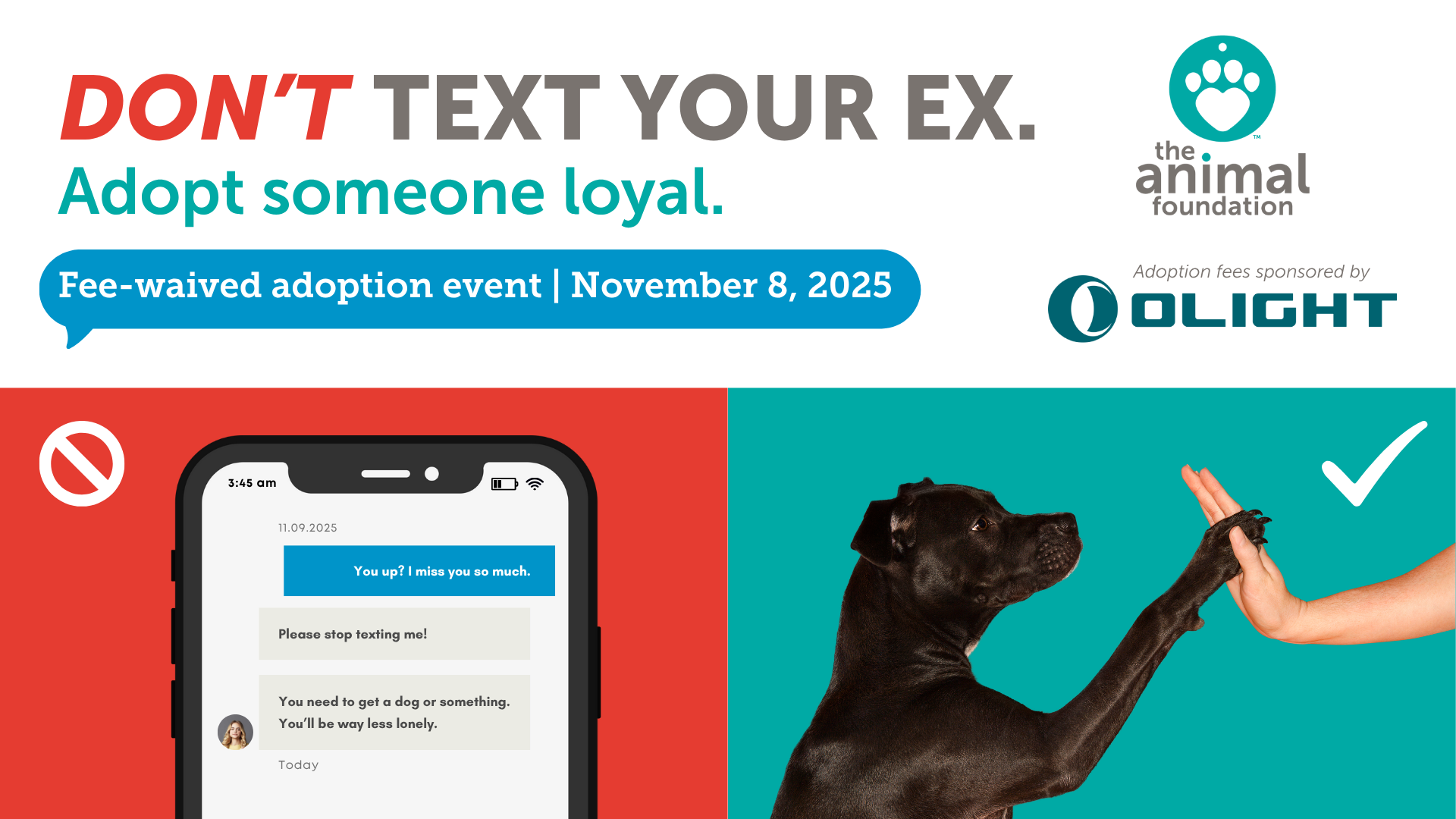 The Animal Foundation 655 N Mojave Rd., Las Vegas, NV, United StatesJoin us for a fee-waived adoption event where every dog, cat, and small pet is ready to make a long-term commitment. Whether you’re looking for someone who actually listens, loves walks, or doesn’t judge your midnight snacking habits—your perfect match is waiting.
