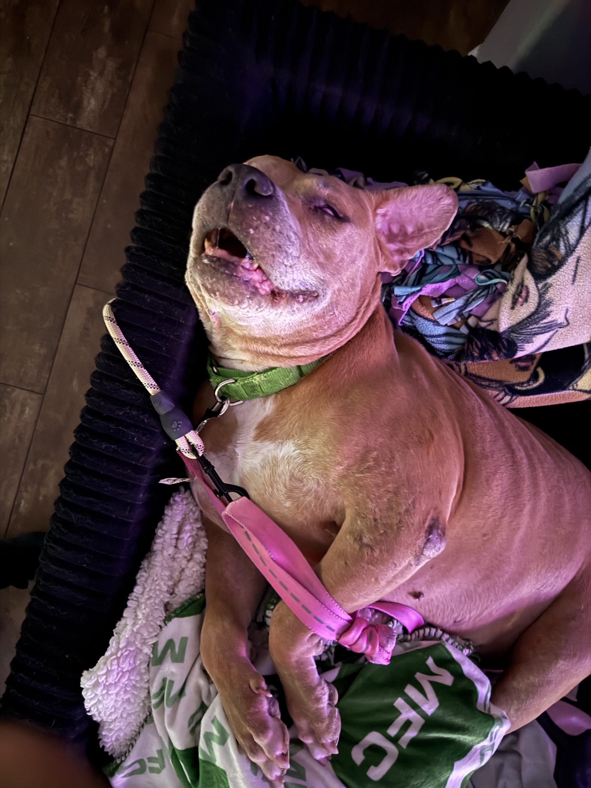 The scars on his face and body showed a rough life with no peace. I didn’t know how long I had with him but I knew I’d make the rest of his days great. I’ve had him almost 4 years now and every day he brings happiness to everyone around him. He has the best smile, even with his bad teeth. He recharges in the sun like any pitty and love company. He would lay in your lap and smile at you all day. He is the most grateful dog. I call him a bucking bronco when it’s time to eat because his whole body bounces around.