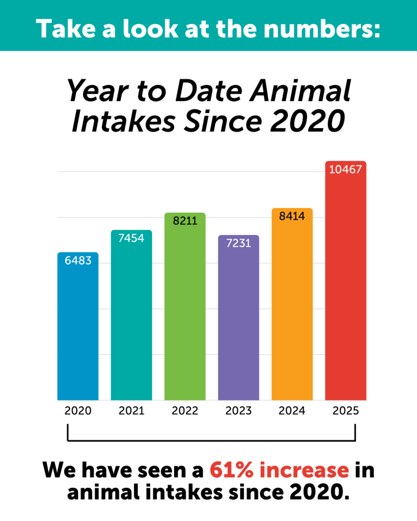 Since 2020, we’ve seen a 61% jump in the number of animals coming through our doors, pushing our capacity to inhumane levels.
