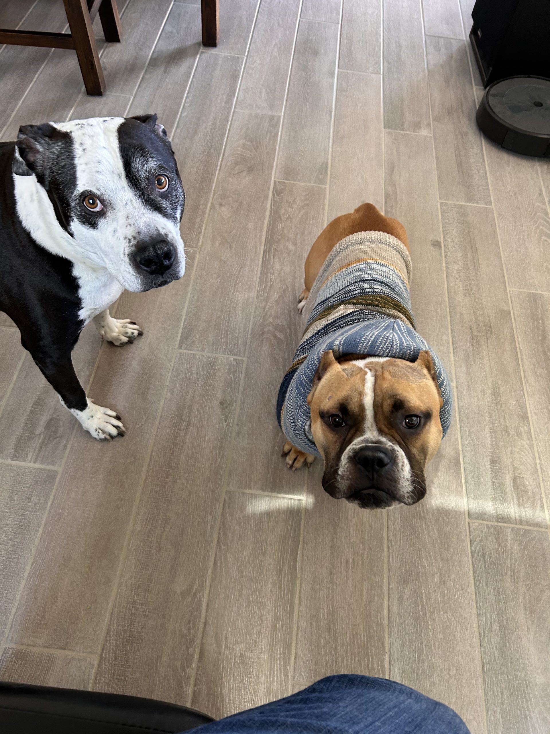 Since Max has been adopted, his wounds have fully healed, he is recovering fantastically, and his family renamed him Logan! He gets along well with his new fur siblings and loves to snuggle in his new sweater. He adores his new people and says hello by slamming his body into them, but in a nice way.