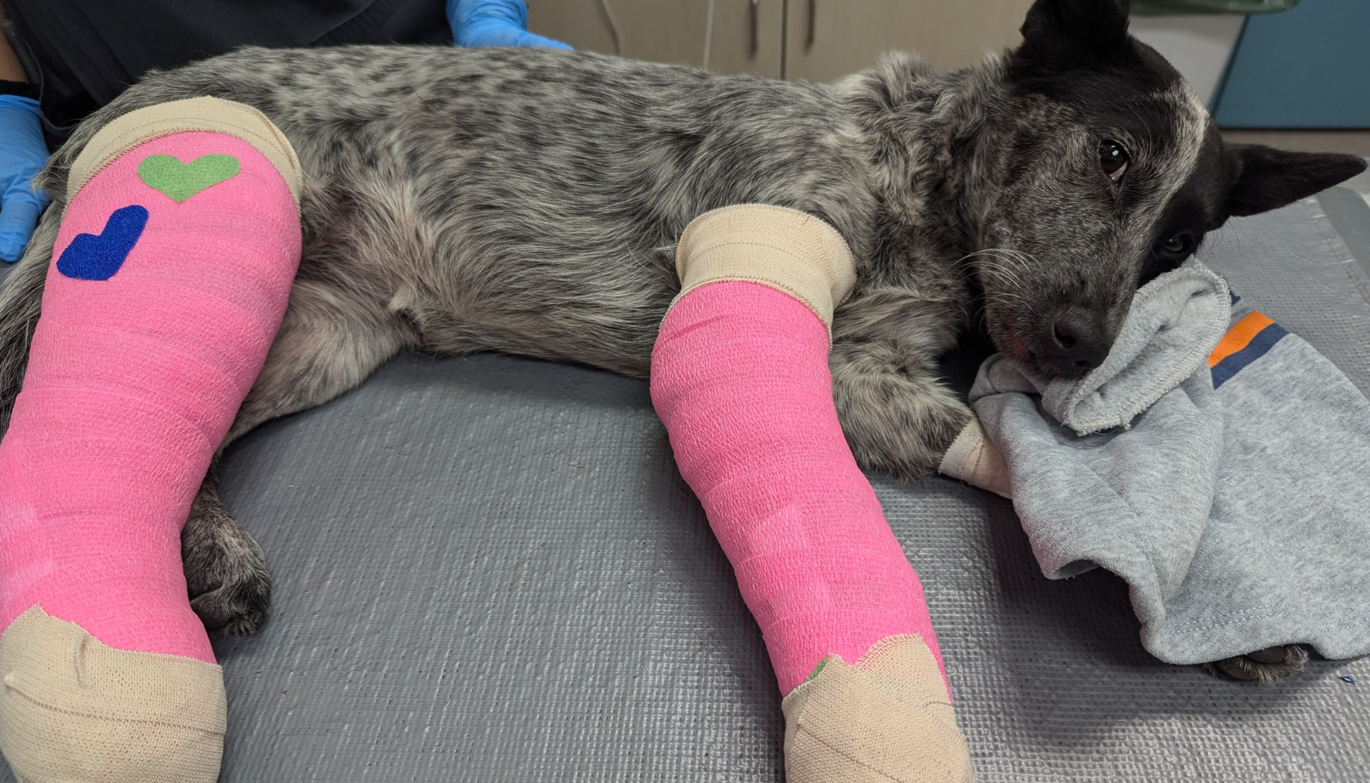 Muffin has already started walking on her healing legs, and while she still has some recovery ahead, her progress has been incredible. As a playful puppy, she doesn’t always understand why she needs to stay in her kennel, but she’s keeping her spirits high with plenty of kisses and snuggles, both with her humans and her favorite lamb toy.