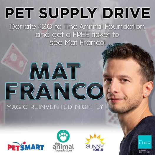 Mat Franco is teaming up with Sunny 106.5 for the fifth year to host a pet supply drive benefitting The Animal Foundation, Nevada’s largest open admission shelter. Visit any Las Vegas-area PetSmart location between Monday, Aug. 15 and Sunday, Sept. 11 to purchase and donate a minimum of $20 worth of items from the organization’s wish list, or a PetSmart gift card of equivalent value, and receive one complimentary ticket voucher to see MAT FRANCO – MAGIC REINVENTED NIGHTLY live onstage in the Mat Franco Theater at The LINQ Hotel + Experience. (Maximum of two vouchers per transaction.)